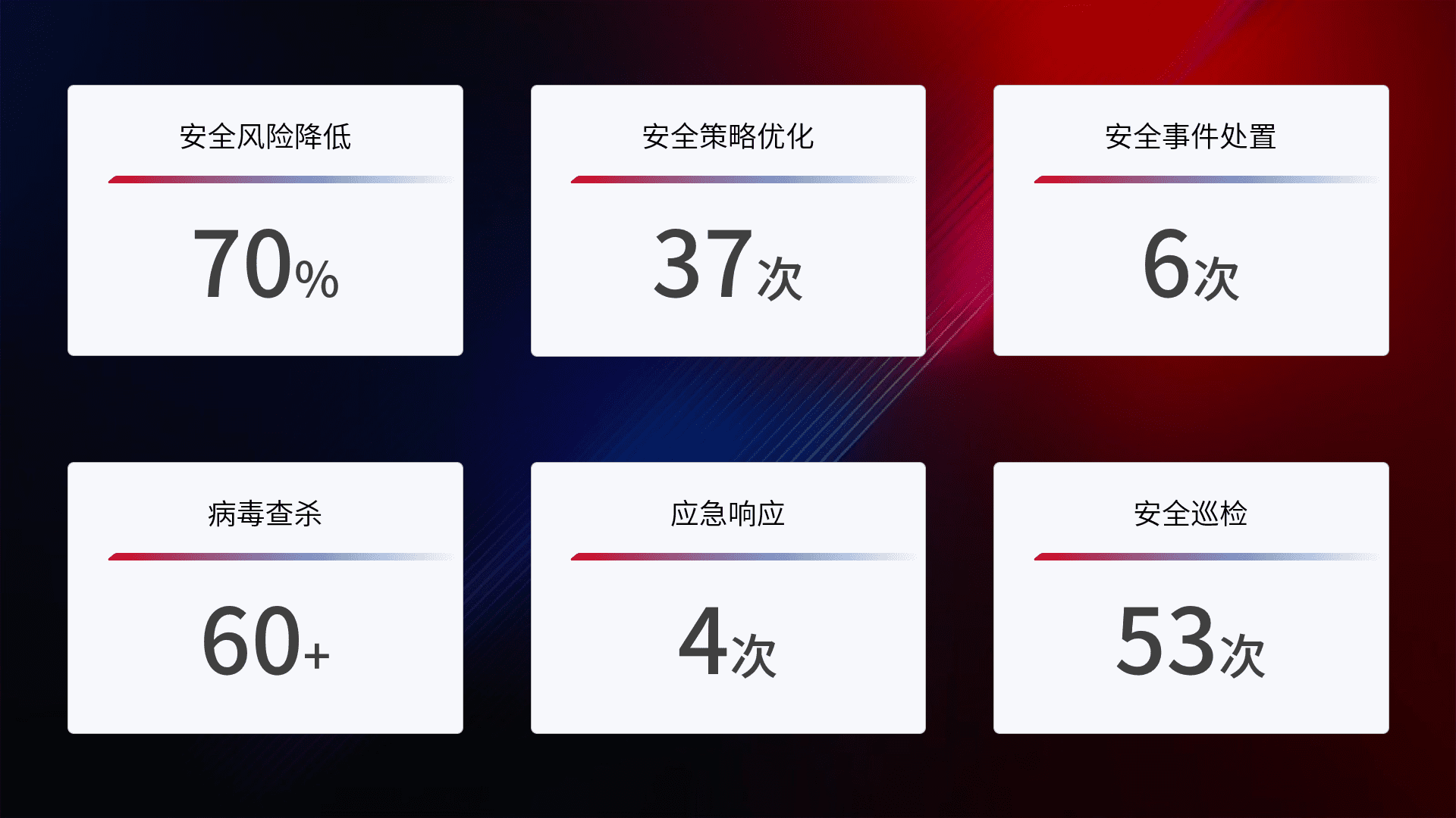 提供全面的安全事件报告体系,,,,包括处置报告、、周报、、、、季度和年度总结,,,结合持续监控,,,,帮助客户深入了解网络安全状况。。。